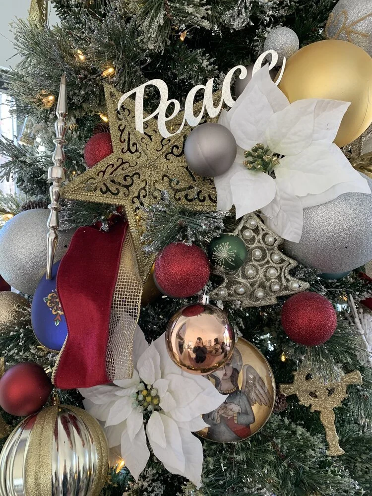 – Firstly, I filled my cart with large balls in various silvers and golds to and add mass and create a base of ornaments. Then I looked for smaller unique ornaments and found stars, bells, snowflakes, snowmen (2 for $1), again in silvers, golds and white. These were going to add interest to the tree without necessarily standing out too much. Finally, I hit a home run and scored 6” and 12” glittery stars. Ooo and I don’t want to forget the white clip-on flowers. The 2019 tree had all of the above placed evenly throughout. The tree was a beautiful success!